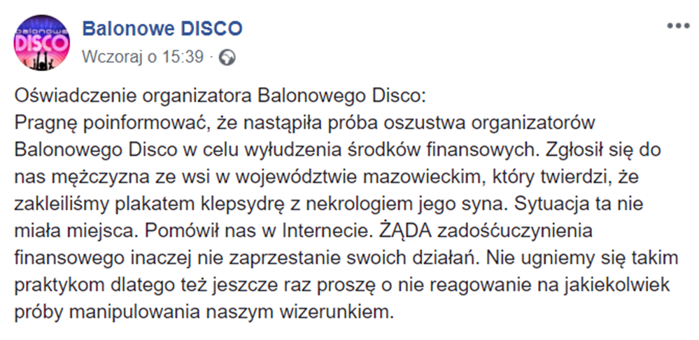 Pragnę poinformować, że nastąpiła próba oszustwa organizatorów Balonowego Disco w celu wyłudzenia środków finansowych. Zgłosił się do nas mężczyzna ze wsi w województwie mazowieckim, który twierdzi, że zakleiliśmy plakatem klepsydrę z nekrologiem jego syna. Sytuacja ta nie miała miejsca. Pomówił nas w Internecie. ŻĄDA zadośćuczynienia finansowego inaczej nie zaprzestanie swoich działań. Nie ugniemy się takim praktykom dlatego też jeszcze raz proszę o nie reagowanie na jakiekolwiek próby manipulowania naszym wizerunkiem
