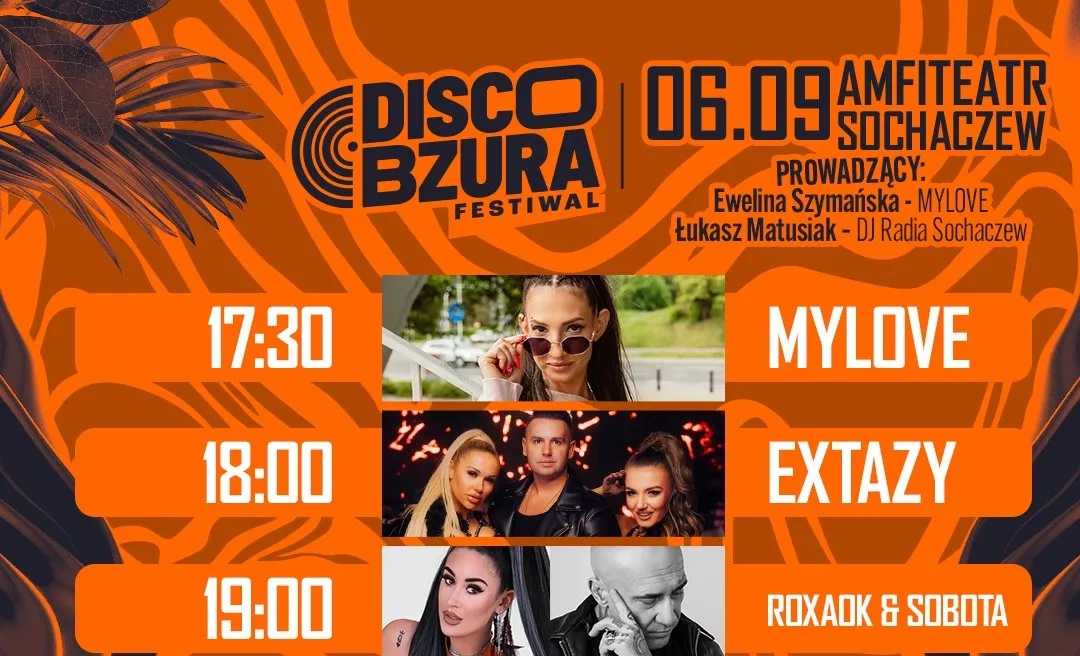 Disco Bzura Festival odbędzie się 6 września 2025 roku w Amfiteatrze w Sochaczewie. Prowadzącymi wydarzenie będą Ewelina Szymańska z projektu Mylove oraz Łukasz Matusiak, znany DJ Radia Sochaczew. Całość wspiera wielu partnerów i patronów, co gwarantuje wysoki poziom organizacyjny oraz świetne warunki dla uczestników.