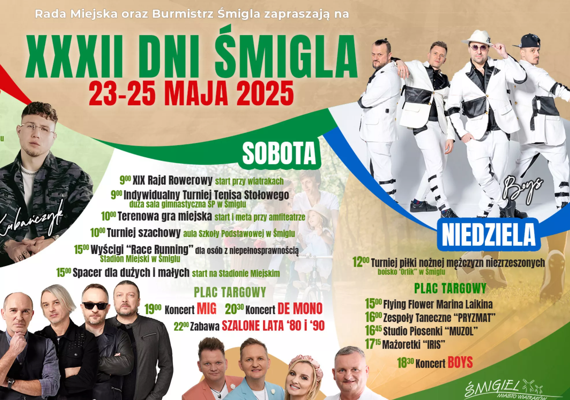 Niedziela, 25 maja, upłynie pod znakiem występu prawdziwej legendy disco polo – zespołu Boys, na czele którego od lat stoi Marcin Miller. Grupa, która przez dekady wylansowała takie przeboje jak ”Jesteś szalona”, ”Najpiękniejsza dziewczyno” czy ”Wolność”, ponownie zawita do Śmigla, by porwać publiczność w niezapomnianą muzyczną podróż. Boys to nie tylko znane utwory, ale także świetne show i niepowtarzalna atmosfera, która towarzyszy każdemu ich koncertowi. Publiczność może spodziewać się zarówno największych klasyków, jak i nowszych kompozycji, które równie mocno rozgrzewają fanów podczas każdego występu.