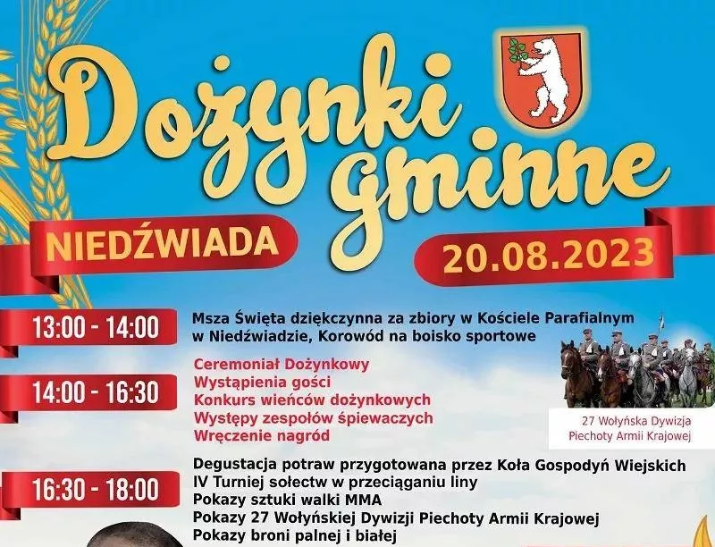 W tym roku, święto plonów, w gminie Niedźwiada (woj. lubelskie) będzie obchodzone 20 sierpnia na boisku sportowym w Niedźwiadzie-Kolonii. Wydarzenie to przebiegnie według wieloletniej tradycji. Rozpocznie się mszą świętą, a zakończy występami gwiazd ze świata muzyki.