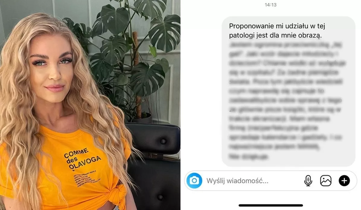 "Proponowanie mi udziału w tej patologi jest dla mnie obrazą. Jestem ogromną przeciwniczką "tej gali". Jaki wzór dajecie młodzieży i dzieciom. Chlanie wódki aż wyląduje się w szpitalu? Za żadne pieniądze świata"