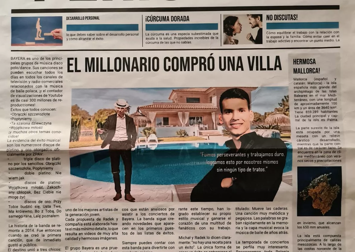 Nasza redakcja disco-polo.info dotarła do źródła tych sensacyjnych doniesień - gazety, która rzekomo informuje o zakupie posiadłości przez Radka Kudelskiego. Okazało się jednak, że wszystko jest częścią mistyfikacji przygotowanej przez zespół Bayera na potrzeby teledysku do nowego singla "Bujaj". Na zdjęciu, które pojawiło się w prasie, widzimy lidera zespołu przy luksusowym domu na Majorce. To jednak tylko inscenizacja, mająca na celu wzbudzenie zainteresowania.