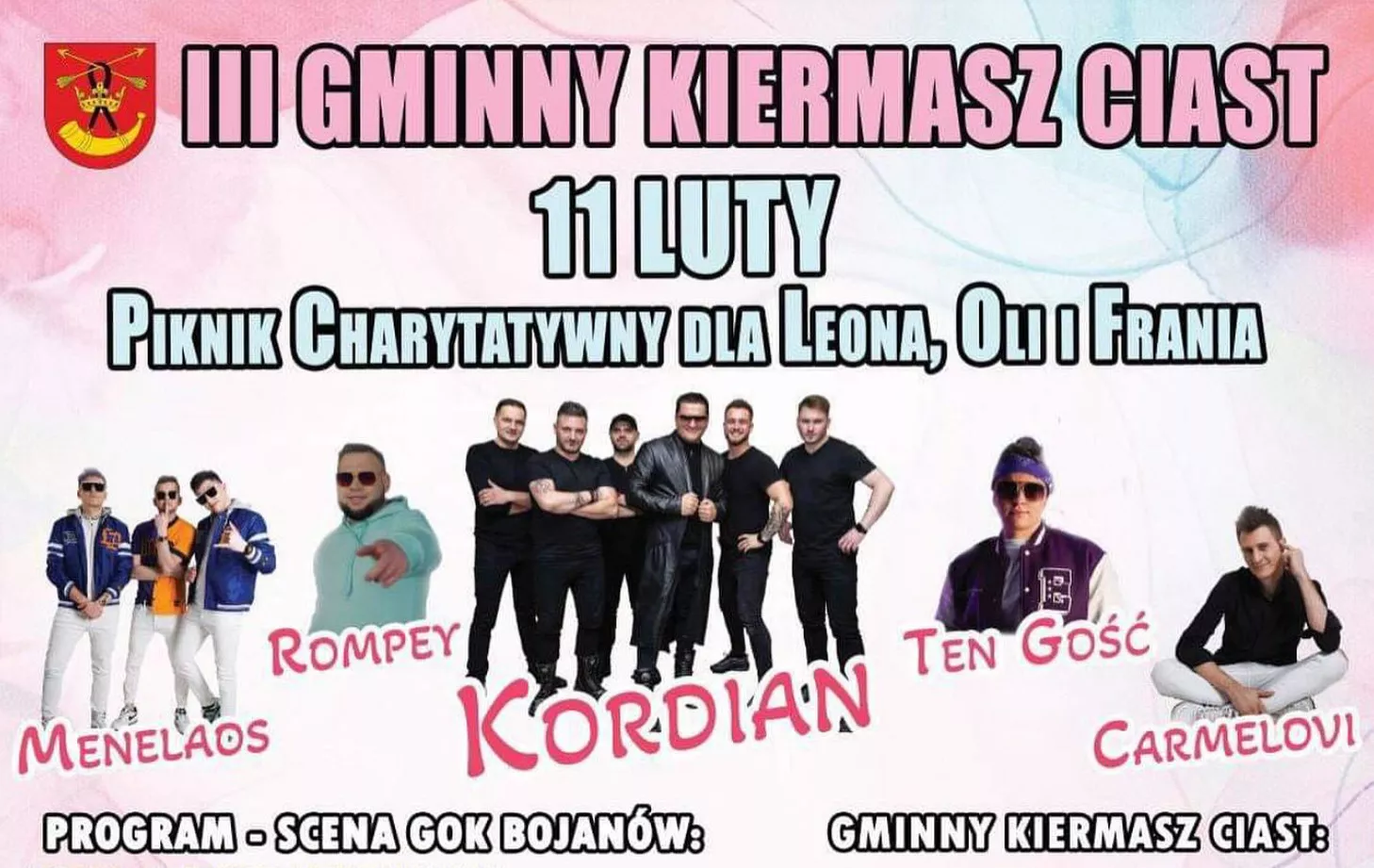 11 lutego w malowniczej miejscowości Bojanów odbędzie się wyjątkowe wydarzenie – III Gminny Kiermasz Ciast. Ta coroczna impreza przyciąga nie tylko miłośników słodkości, ale również fanów energicznych rytmów disco polo. W tym roku organizatorzy postawili na wyjątkową atrakcję – koncerty gwiazd disco polo, które zapewnią niezapomniane wrażenia wszystkim uczestnikom. Impreza to tak naprawę pikinik charytatywny dla Leona, Oli oraz Frania