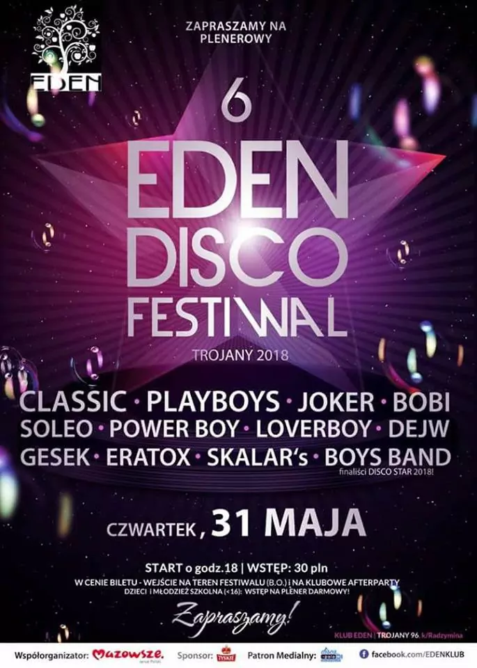 Strona główna › Koncerty › 6 Eden Disco Festiwal Trojany 2018 Koncert 6 Eden Disco Festiwal Trojany 2018 Czwartek, 31 maja 2018 Trojany Zobacz plakat Miejsce Trojany Data Czwartek, 31 maja 2018 Udostępnij Reklama Inne koncerty Wszystkie → Wielkanoc 2026 w Club Scorpio 05.04.2026 Wnory Wiechy Topky - Gorzko Gorzko Gdańsk 17.04.2026 Gdańsk Disco nad Czosem 3 19.06.2026 Mrągowo Kielecka Gala Disco Polo 2026 19.06.2026 Amfiteatr Kadzielnia - Kielce