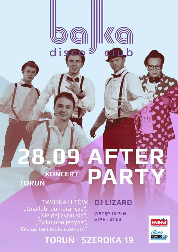 Strona główna › Koncerty › Bajka Disco Club Toruń - After Party Koncert Bajka Disco Club Toruń - After Party Adam Begier Dodano: 02.12.2020, 00:00 Miejsce Toruń Data Piątek, 28 września 2018 Udostępnij Reklama Inne koncerty Wszystkie → Piękni i Młodzi - Club Best 2026 25.04.2026 Club Best Września Power Play - Klub Gorzelnia Łabunie 25.04.2026 Klub Gorzelnia, Łabunie Klaudia Zielińska - Teatro Gdynia - 25 kwietnia 25.04.2026 Teatro, Gdynia Łobuzy - Niech Żyje Bal Siedlce - 25 kwietnia 25.04.2026 Niech Żyje Bal, Siedlce