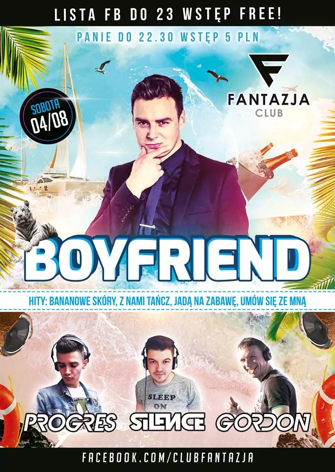 Strona główna › Koncerty › Club Fantazja - Boyfriend Koncert Club Fantazja - Boyfriend Adam Begier Dodano: 02.12.2020, 00:00 Miejsce Jaświły Data Sobota, 4 sierpnia 2018 Udostępnij Reklama Inne koncerty Wszystkie → Piękni i Młodzi - Club Best 2026 25.04.2026 Club Best Września Power Play - Klub Gorzelnia Łabunie 25.04.2026 Klub Gorzelnia, Łabunie Klaudia Zielińska - Teatro Gdynia - 25 kwietnia 25.04.2026 Teatro, Gdynia Łobuzy - Niech Żyje Bal Siedlce - 25 kwietnia 25.04.2026 Niech Żyje Bal, Siedlce
