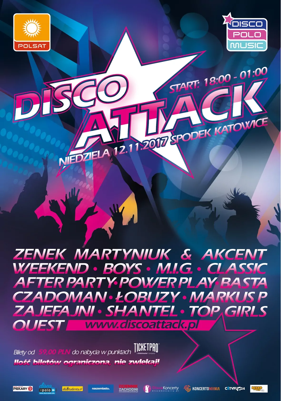 Strona główna › Koncerty › Disco Attack 2017 Disco Attack 2017 Niedziela, 12 listopada 2017 Katowice Udostępnij Inne koncerty Wszystkie → Festiwal Weselnych Przebojów 2026 14.08.2026 Mrągowo