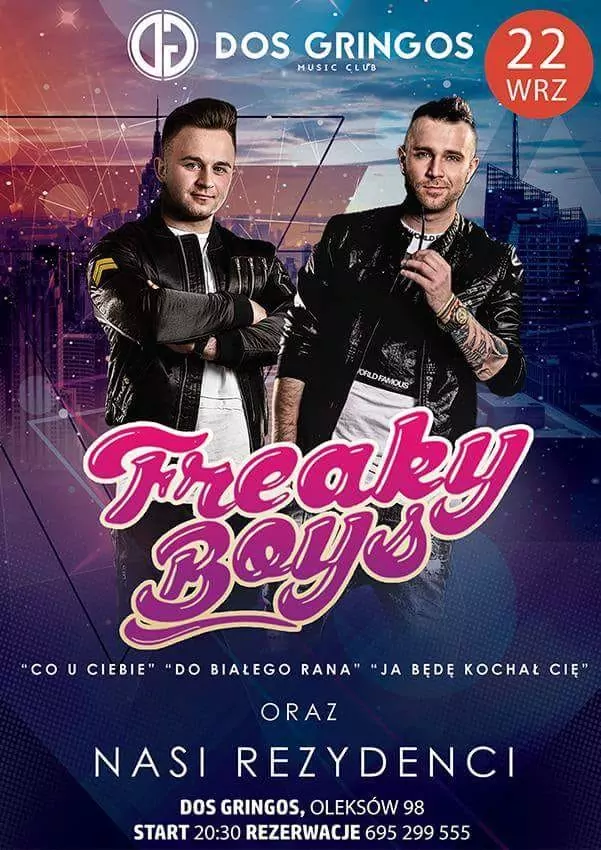Strona główna › Koncerty › Dos Gringos - Freaky Boys Koncert Dos Gringos - Freaky Boys Adam Begier Dodano: 02.12.2020, 00:00 Miejsce Oleksów Data Sobota, 22 września 2018 Udostępnij Reklama Inne koncerty Wszystkie → Piękni i Młodzi - Club Best 2026 25.04.2026 Club Best Września Power Play - Klub Gorzelnia Łabunie 25.04.2026 Klub Gorzelnia, Łabunie Klaudia Zielińska - Teatro Gdynia - 25 kwietnia 25.04.2026 Teatro, Gdynia Łobuzy - Niech Żyje Bal Siedlce - 25 kwietnia 25.04.2026 Niech Żyje Bal, Siedlce