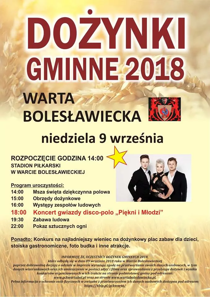 Strona główna › Koncerty › Dożynki Gminne - Warta Bolesławiecka Koncert Dożynki Gminne - Warta Bolesławiecka Adam Begier Dodano: 02.12.2020, 00:00 Miejsce Warta Bolesławiecka Data Niedziela, 9 września 2018 Udostępnij Reklama Inne koncerty Wszystkie → Piękni i Młodzi - Club Best 2026 25.04.2026 Club Best Września Power Play - Klub Gorzelnia Łabunie 25.04.2026 Klub Gorzelnia, Łabunie Klaudia Zielińska - Teatro Gdynia - 25 kwietnia 25.04.2026 Teatro, Gdynia Łobuzy - Niech Żyje Bal Siedlce - 25 kwietnia 25.04.2026 Niech Żyje Bal, Siedlce