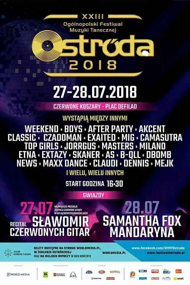 Strona główna › Koncerty › Festiwal Ostróda 2018 Koncert Festiwal Ostróda 2018 Piątek, 27 lipca 2018 Ostróda Zobacz plakat Miejsce Ostróda Data Piątek, 27 lipca 2018 Udostępnij Reklama Powiązane artykuły MiłyPan, Defis i Topky podbili scenę na Disco Festiwal Ostróda 2024 z przebojem „Jeden Taniec Jedna Noc” 13.09.2024, 19:22 Festiwal Ostróda 2018: Sobota: Debiuty, Koncert premier (bez grupy Akcent), Mandaryna! Lista wykonawców, bilety, VIP oraz transmisja live w TV! 28.07.2018, 18:21 Ruszyła sprzedaż biletów na : Festiwal Ostróda 2017 27.01.2017, 17:35 Festiwal Ostróda: D-Bomb - wywiad i relacja 08.09.2015, 01:23 Festiwal Ostróda: Temptation Pułtusk - wywiad 04.09.2015, 16:26 Festiwal Ostróda: Mig - relacja i wywiad 24.08.2015, 02:24 Festiwal Ostróda: Camasutra - wywiad i relacja 13.08.2015, 16:10 Festiwal Ostróda: Exaited & Maciek Smoliński - relacja i wywiad 09.08.2015, 02:03 Festiwal Ostróda: 25-lecie Boys - relacja i wywiad 07.08.2015, 02:03 Festiwal Ostróda: Freaky Boys - relacja i wywiad 04.08.2015, 21:52 Festiwal Ostróda: Mario Bischin - wywiad 03.08.2015, 21:08 Festiwal Ostróda 2015: wywiad z After Party 29.07.2015, 21:14 Festiwal Ostróda: Koncert Gwiazd i najnowsze info 07.07.2015, 22:23 Festiwal Ostróda ogłasza konkurs: zostań fanem 20-lecia! 04.07.2015, 15:00 Festiwal Ostróda: Debiutanci 02.07.2015, 16:26 Festiwal Ostróda: Loona zaprasza na gorącą imprezę 16.06.2015, 13:53 Pokaż więcej (8) Inne koncerty Wszystkie → Wielkanoc 2026 w Club Scorpio 05.04.2026 Wnory Wiechy Topky - Gorzko Gorzko Gdańsk 17.04.2026 Gdańsk Disco nad Czosem 3 19.06.2026 Mrągowo Kielecka Gala Disco Polo 2026 19.06.2026 Amfiteatr Kadzielnia - Kielce