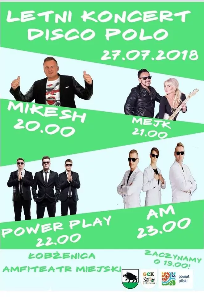 Strona główna › Koncerty › Letni koncert Disco Polo 2018 Koncert Letni koncert Disco Polo 2018 Piątek, 27 lipca 2018 Łobżenica Zobacz plakat Miejsce Łobżenica Data Piątek, 27 lipca 2018 Udostępnij Reklama Powiązane artykuły Zespół Mejk i Milano zagrają nad Jeziorem Grzymisławskim. Letni koncert disco polo w Śremie już 4 lipca 2026 20.03.2026, 12:59 Inne koncerty Wszystkie → Wielkanoc 2026 w Club Scorpio 05.04.2026 Wnory Wiechy Topky - Gorzko Gorzko Gdańsk 17.04.2026 Gdańsk Disco nad Czosem 3 19.06.2026 Mrągowo Kielecka Gala Disco Polo 2026 19.06.2026 Amfiteatr Kadzielnia - Kielce