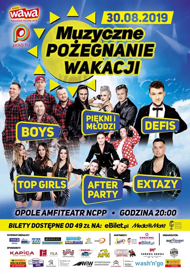 Strona główna › Koncerty › Muzyczne Pożegnanie Wakacji - Opole 2019 Koncert Muzyczne Pożegnanie Wakacji - Opole 2019 Piątek, 30 sierpnia 2019 Opole Zobacz plakat Miejsce Opole Data Piątek, 30 sierpnia 2019 Udostępnij Reklama Inne koncerty Wszystkie → Wielkanoc 2026 w Club Scorpio 05.04.2026 Wnory Wiechy Topky - Gorzko Gorzko Gdańsk 17.04.2026 Gdańsk Disco nad Czosem 3 19.06.2026 Mrągowo Kielecka Gala Disco Polo 2026 19.06.2026 Amfiteatr Kadzielnia - Kielce