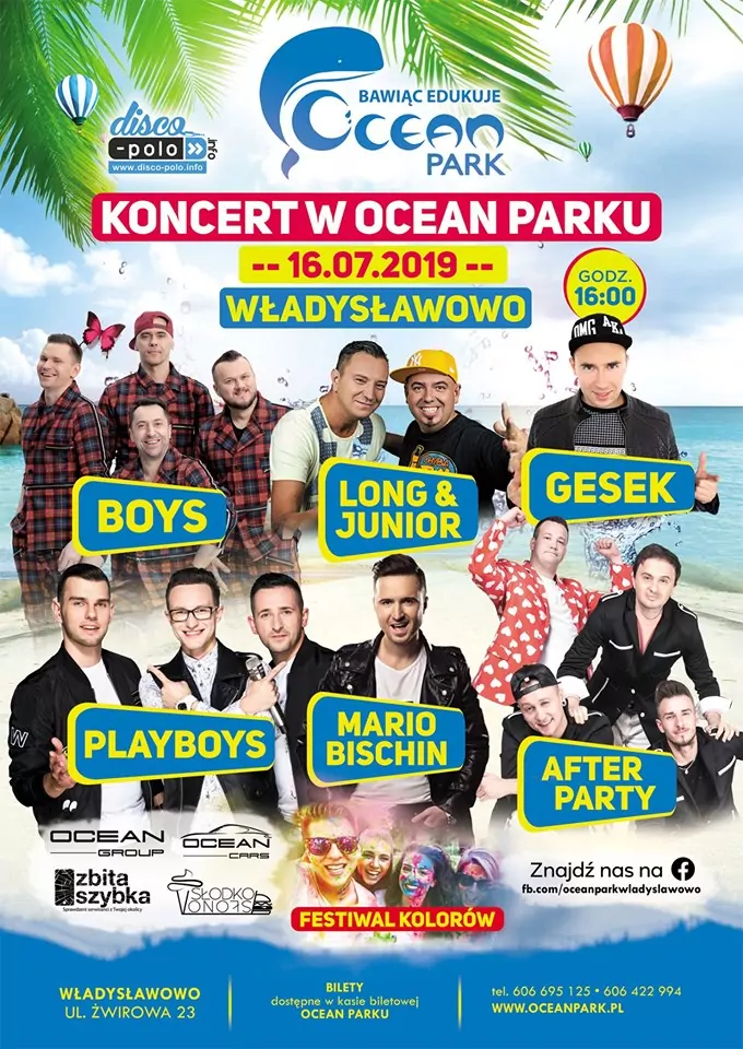 Strona główna › Koncerty › Ocean Park - Festiwal Disco Polo 2019 - 16 lipca Koncert Ocean Park - Festiwal Disco Polo 2019 - 16 lipca Wtorek, 16 lipca 2019 Władysławowo Zobacz plakat Miejsce Władysławowo Data Wtorek, 16 lipca 2019 Udostępnij Reklama Inne koncerty Wszystkie → Wielkanoc 2026 w Club Scorpio 05.04.2026 Wnory Wiechy Topky - Gorzko Gorzko Gdańsk 17.04.2026 Gdańsk Disco nad Czosem 3 19.06.2026 Mrągowo Kielecka Gala Disco Polo 2026 19.06.2026 Amfiteatr Kadzielnia - Kielce