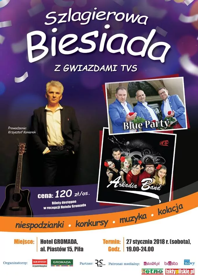 Strona główna › Koncerty › Szlagierowa Biesiada - Piła Koncert Szlagierowa Biesiada - Piła Adam Begier Dodano: 02.12.2020, 00:00 Zobacz plakat Miejsce Piła Data Sobota, 27 stycznia 2018 Udostępnij Reklama Inne koncerty Wszystkie → Topky - Scorpio Club - 18 kwietnia 18.04.2026 Scorpio Club, Wnory-Wiechy Boys - Lux Club Brzozowa - 18 kwietnia 18.04.2026 Lux Club, Brzozowa Skaner - Face Club Olsztyn - 18 kwietnia 18.04.2026 Face Club, Olsztyn Piękni i Młodzi - Club Best 2026 25.04.2026 Club Best Września