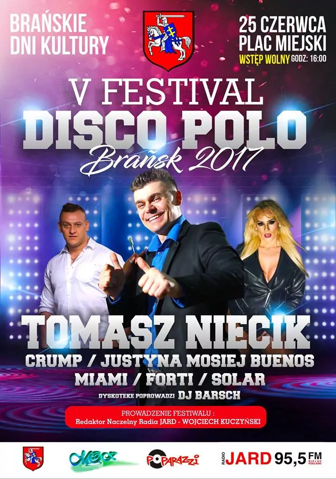 Strona główna › Koncerty › V Festival Disco Polo Brańsk 2017 Koncert V Festival Disco Polo Brańsk 2017 Niedziela, 25 czerwca 2017 Brańsk Zobacz plakat Miejsce Brańsk Data Niedziela, 25 czerwca 2017 Udostępnij Reklama Inne koncerty Wszystkie → Wielkanoc 2026 w Club Scorpio 05.04.2026 Wnory Wiechy Topky - Gorzko Gorzko Gdańsk 17.04.2026 Gdańsk Disco nad Czosem 3 19.06.2026 Mrągowo Kielecka Gala Disco Polo 2026 19.06.2026 Amfiteatr Kadzielnia - Kielce