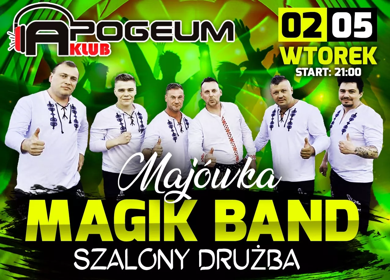 Jeśli chcesz spędzić wieczór w gronie przyjaciół i przeżyć niezapomnianą noc z najlepszą polską muzyką, koniecznie wybierz się na koncert Magik Bandu i Szalonego Drużby 2 maja do klubu Apogeum! Imprezę poleca serwis disco-polo.info