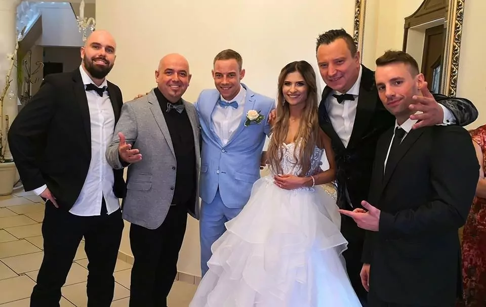 Do wpisu dołączone jest zdjęcie, na którym zakochani uśmiechają się w towarzystwie członków zespołu.