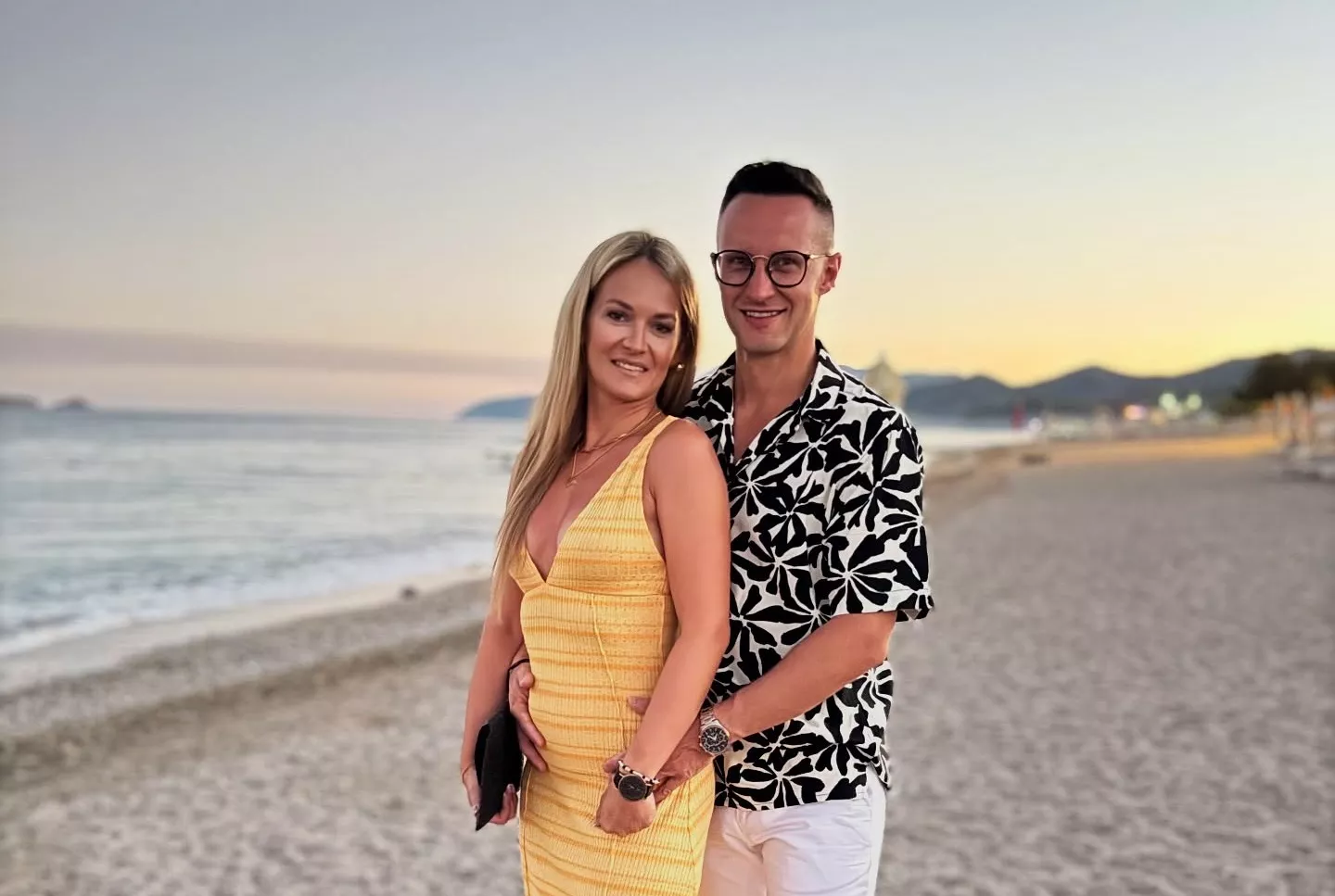 Na najnowszych zdjęciach Kuba Urbański pozuje z żoną podczas wyjątkowego, nadmorskiego zachodu słońca. To ujęcia pełne emocji i naturalności. Ewelina prezentuje się w długiej, dopasowanej, żółtej sukni z głębokim dekoltem, a do stylizacji dobrała białe szpilki, które dodają całości elegancji i subtelnego seksapilu. Jej wygląd określany jest jako zjawiskowy, kobiecy i pełen klasy. Bliskość pary, gesty i pocałunek uchwycone na fotografiach tworzą filmową atmosferę, pełną romantyzmu i namiętności.