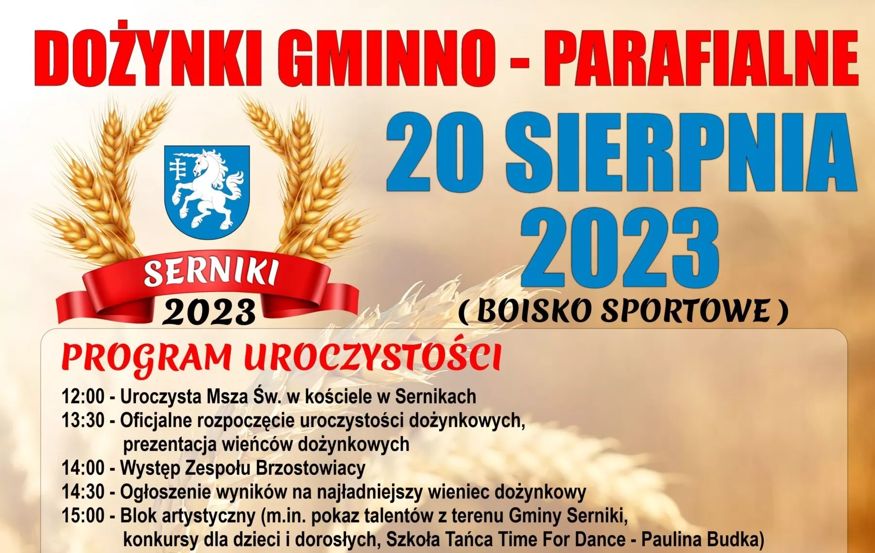 Tegoroczne Święto Plonów w Sernikach odbędzie się w przedostatnią niedzielę sierpnia – 20.08.2023 roku. Wydarzenie, jak nakazuje wieloletnia tradycja, rozpocznie się uroczystą mszą świętą w Kościele pw. św. Marii Magdaleny o godzinie 12:00. Podczas liturgii wierni będą dziękować Bogu za urodzajne plony. Po zakończonej mszy zostanie utworzony korowód dożynkowy, który przejdzie na miejsce imprezy – boisko sportowe.