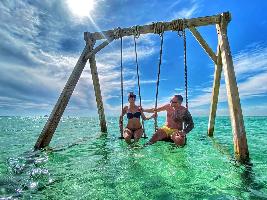 Bujają się na huśtawce, która jest ustawiona w wodzie. Za nimi widzimy piękny krajobraz - niczym scena z hollywodzkiego filmu.