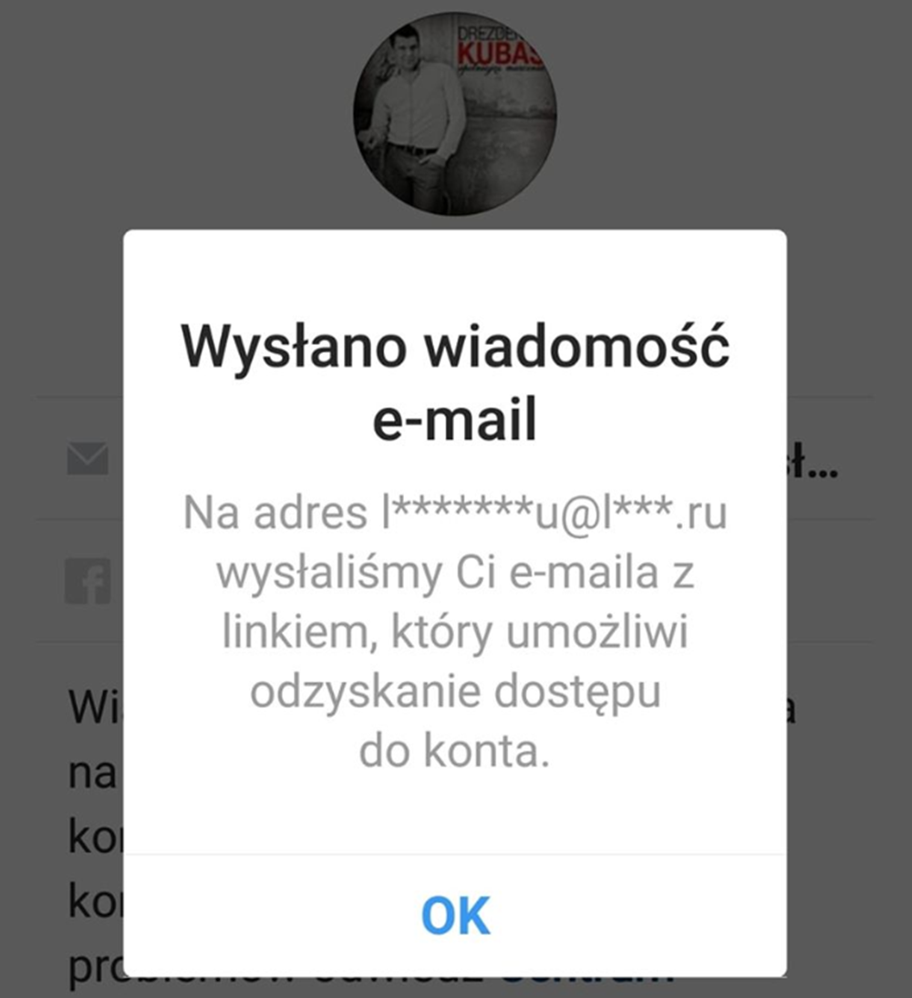 Wczoraj wylogowało mnie z instagrama, każda próba zalogowania się nie jest skuteczna bo adres e-mail wraz z nr. telefonu został zmieniony na rosyjski - wyjaśnił we wpisie Dariusz Kubiak Drezdenko udostępniając screen wiadomości