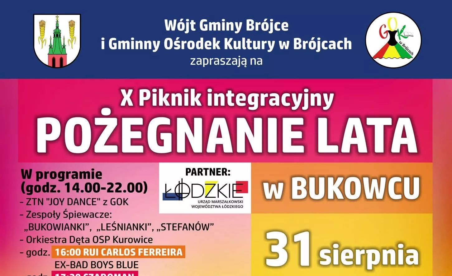 X Piknik integracyjny Pożegnanie Lata odbędzie się 31 sierpnia 2025 roku (niedziela) na terenie Bukowca, ul. Górna 29. Wstęp na wydarzenie jest bezpłatny. Całość poprowadzi Magdalena Michalak-Szwarc. Organizatorami imprezy są Wójt Gminy Brójce oraz Gminny Ośrodek Kultury w Brójcach przy współpracy z Urzędem Marszałkowskim Województwa Łódzkiego.