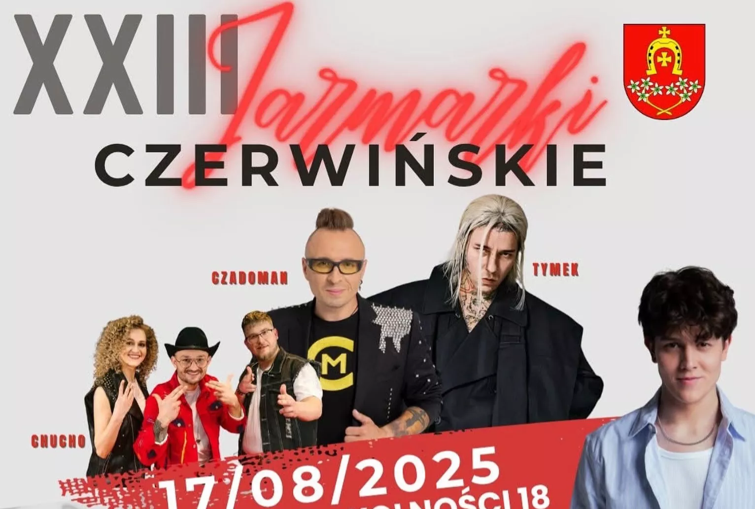 Koncertowa część wydarzenia rozpocznie się o 18:00 występem Chucho, a następnie o 19:15 sceną zawładnie Czadoman. O 20:45 zaplanowano pokaz pirotechniczny, który rozświetli niebo nad Czerwińskiem i będzie wizualnym wstępem do jednego z najbardziej wyczekiwanych występów. O 21:00 publiczność usłyszy Oskara Cymsa, który zaprezentuje swoje najpopularniejsze utwory w wyjątkowej oprawie. Następnie o 22:30 wystąpi Tymek, a imprezę zakończy energetyczny set DJ Speedy o 23:30. Harmonogram został tak ułożony, aby emocje rosły wraz z upływem wieczoru, a każdy z artystów mógł w pełni zaprezentować swoje możliwości