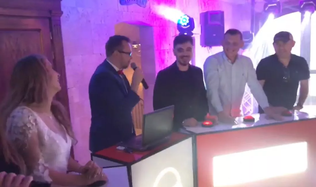 Charyzmatyczny Wojtek zorganizował zabawę w formie teleturnieju "Jaka to melodia". W zabawie brali udział Państwo Młodzi oraz zaproszeni goście.